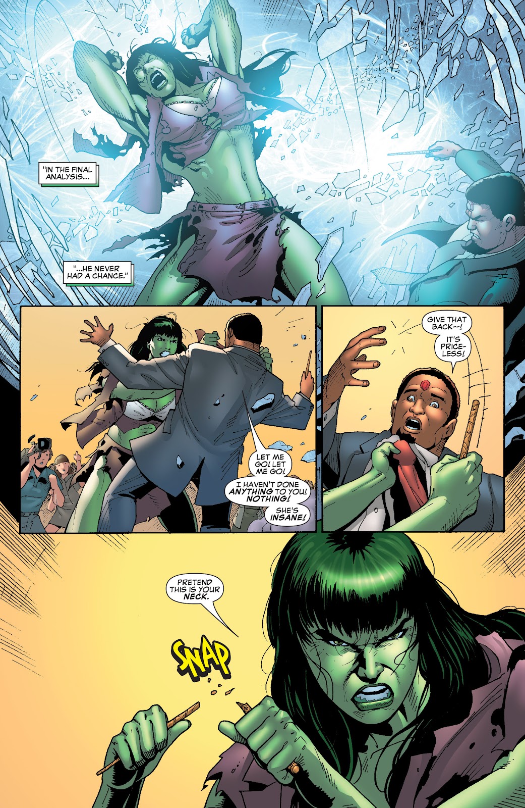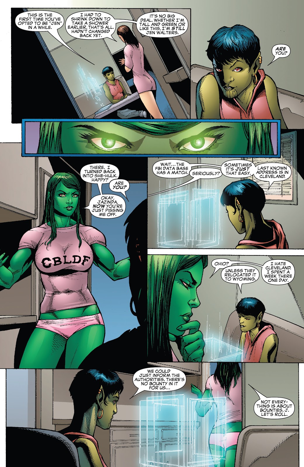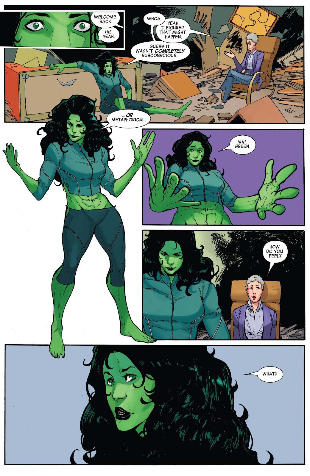 This contrast Banner's and other male Hulks' transformation that often left them shirtless. - Battle in the Center of the Mind: Invoked in The Avengers (2018) #20, which opens with Jennifer Walters presiding as judge over a court case in which the classic She-Hulk debates the new "Hulk" form over whether or not she deserves to be the dominant She-Hulk identity, which dissolves into an outright brawl between the two as classic She-Hulk demands "Hulk" be erased from existence. It's then revealed that this is actually Jen using technology in the new Celestial corpse-turned-Avengers HQ to engage in "psychoactive calisthenics" to try and gain better control over her new identity.