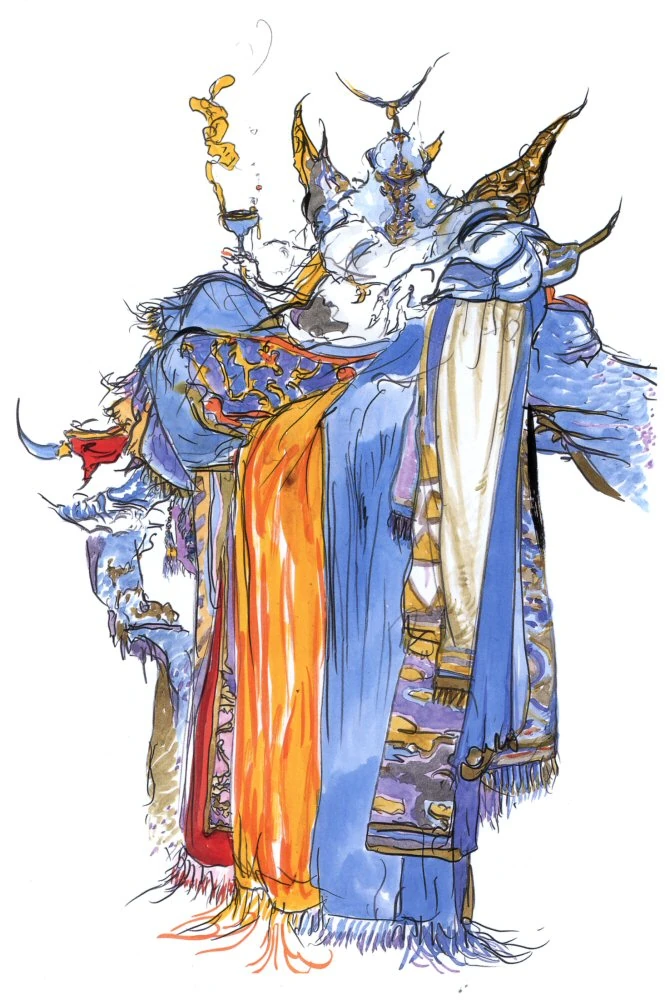 Yoshitaka Amano concept art for Final Fantasy V depicts the main villain, Exdeath, lounging with a goblet of... something. He's probably only doing it for looks since for one thing, he still has his helmet on, and for another he's an evil tree.