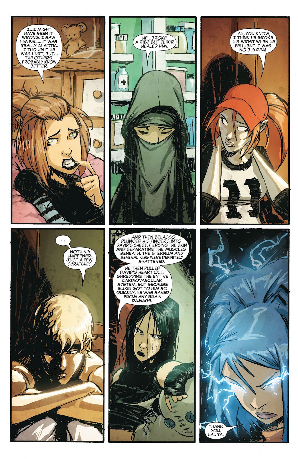 - New X-Men: When questioned by Surge concerning what happened to her boyfriend David during a demonic attack on the X-Mansion, most of the team made evasive and inconsistent references to minor injuries.