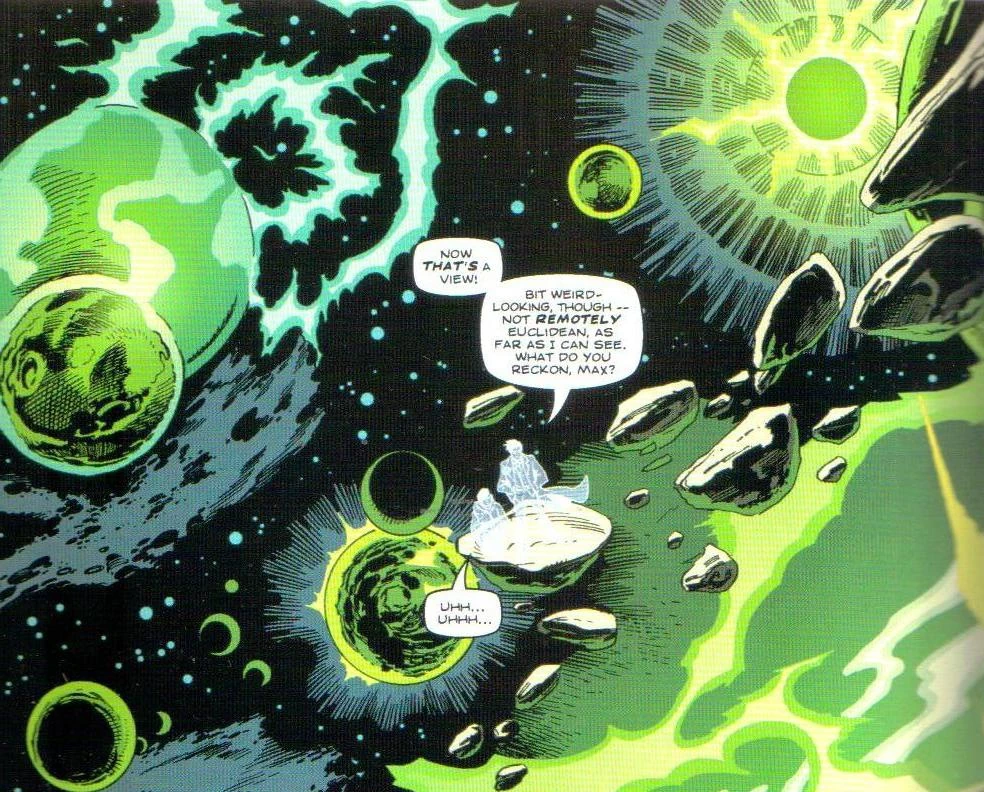 - The Furthest Ring, which is a space filled with Eldritch Abominations that links all universes and their timelines together. To further complicate matters, most of those who are there, who are any combination of either really being there, asleep and dreaming under special conditions, or dead, have dream bubbles where they can navigate through their memories, which causes time to either go forward or backwards. It's to the point where one would have to have mastery of time and/or space or near-perfect omniscience just to be able to navigate it without getting lost. Fortunately, our heroes have all three.