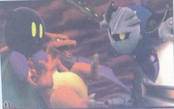 You cannot firmly grasp the true form of Squidward's technique!...Meta Knight is right there and it's pretty clear that Kirby is in Meta Knight colors. Same body color (abit under the mask for Meta Knight), same eye color, heck, Kirby's shoes are purple like Meta Knight's boots!
