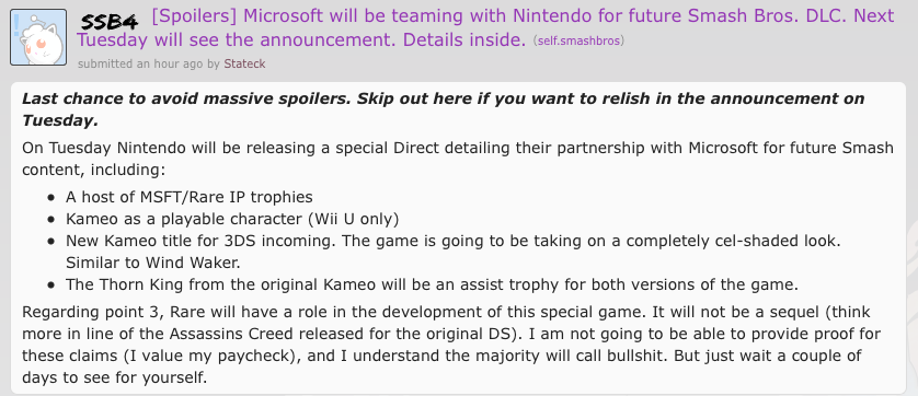 It's also probably safe to say that any character-based Smash "leak" is dead in the water anyway as we're probably not going to get any further announcements of that sort until October.