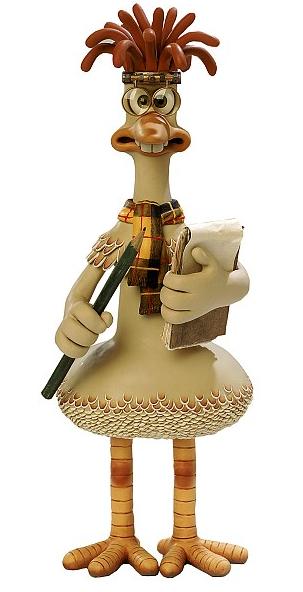 it's an actual fucking chicken... With a backpack and a crossbow and a very patchy makeshift labcoat and a tiny chicken version of one of those Scottish hats with the fuzzy pompom on top.)