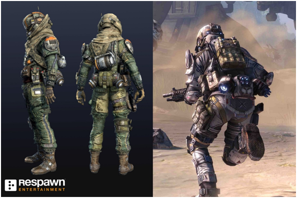 -Before landing on the ground on two feet, as if he just jumped a foot or two, the booster pack softening the fall-