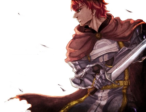 -He's dressed in the garb of some sort of crusading warrior, with a bright red cloak to boot-