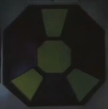 -Next to it, hooked up to a crane, is a large, steel cuboid object, with a symbol