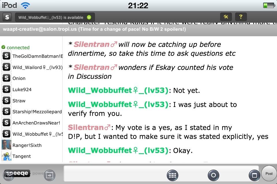 And as for Avenger, it's now 3-3... and I'm still not 100% sure what Tracer's vote is. You're wording it in an unusual way. Since we had a serious problem with misunderstandings earlier today, could you clarify with just "yes" or "no"?