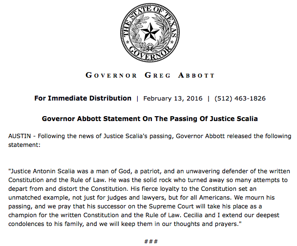 From the office of Texas Governor Greg Abbott on Scalia's death.