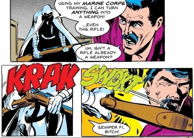 "Random bullshit go" was also a thing that Moon Knight actually did in the comics at one point. That pic isn't an edit. At one point one of Moon Knight's tactics was to literally grab as much as he could from his pockets and chuck them all at once.