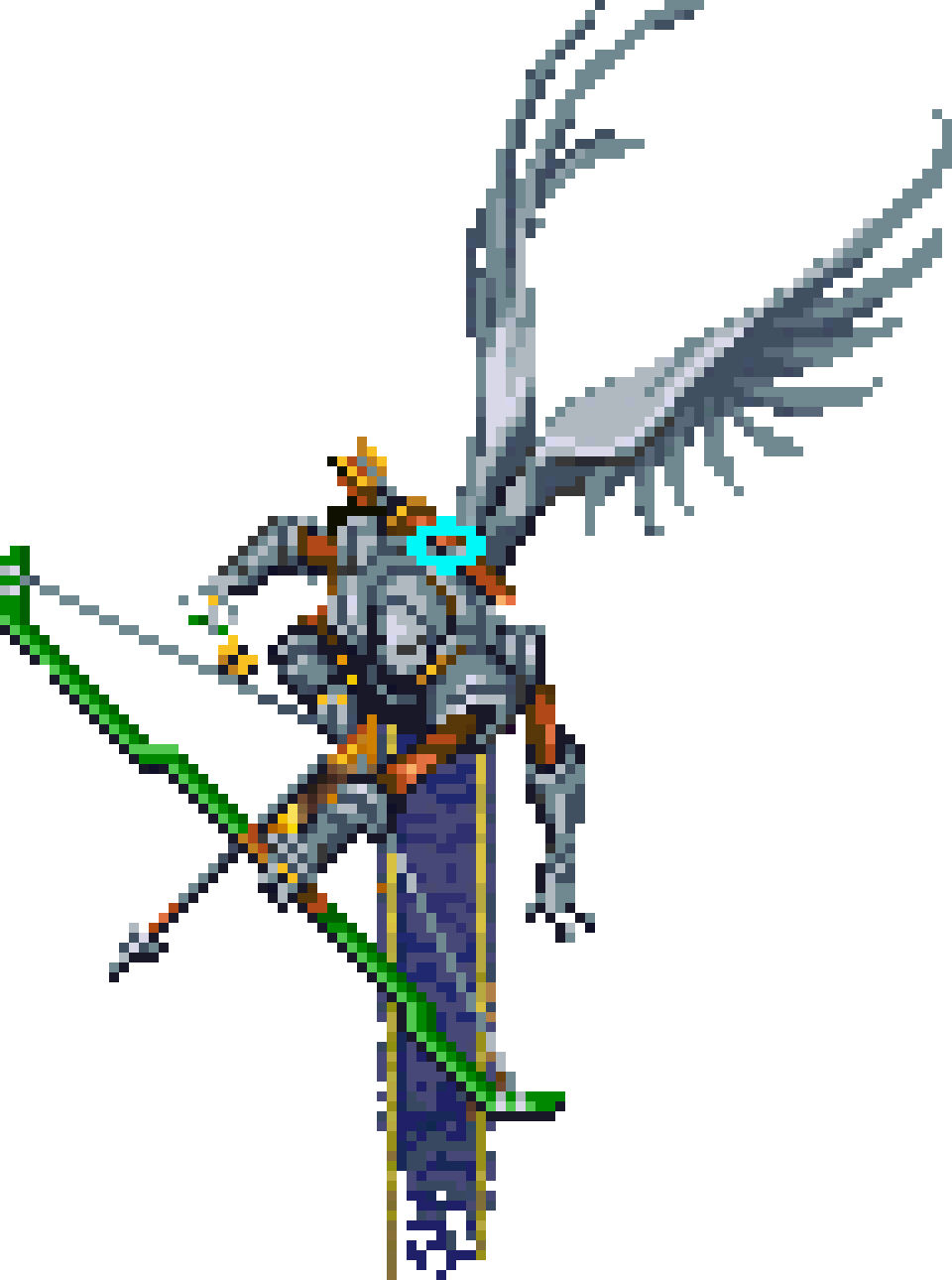 ◊ flies on white, feathery wings. In it's hand is an enormous bow. It slowly knocks it back, and a long shaft of light forms out from the bowstring, aimed and ready-