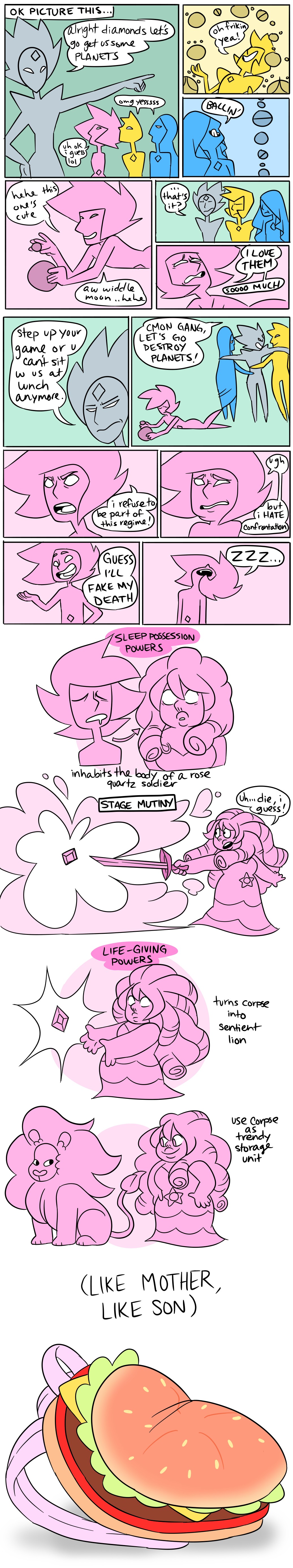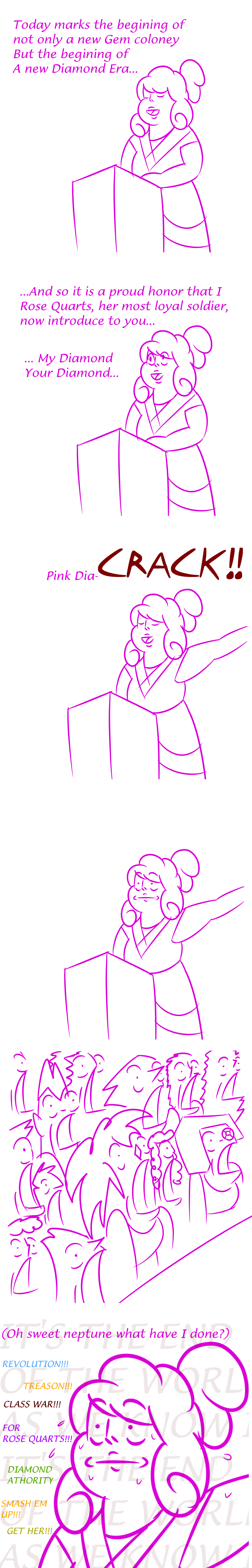 I don't know why I feel this way, but I get the impression that Pink Diamond wasn't as big a tool as the others. Maybe it's just the fact that Earth and the Moon were her first colonies. Also, that must suck. All the other Diamonds have a dozen colonies to their name, but the first time YOU build a colony BAM! Rebellion! Then you die!