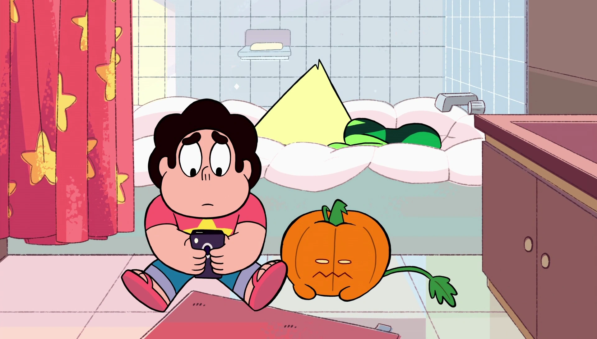 - Steven gave Peridot bedding for the tub this time.