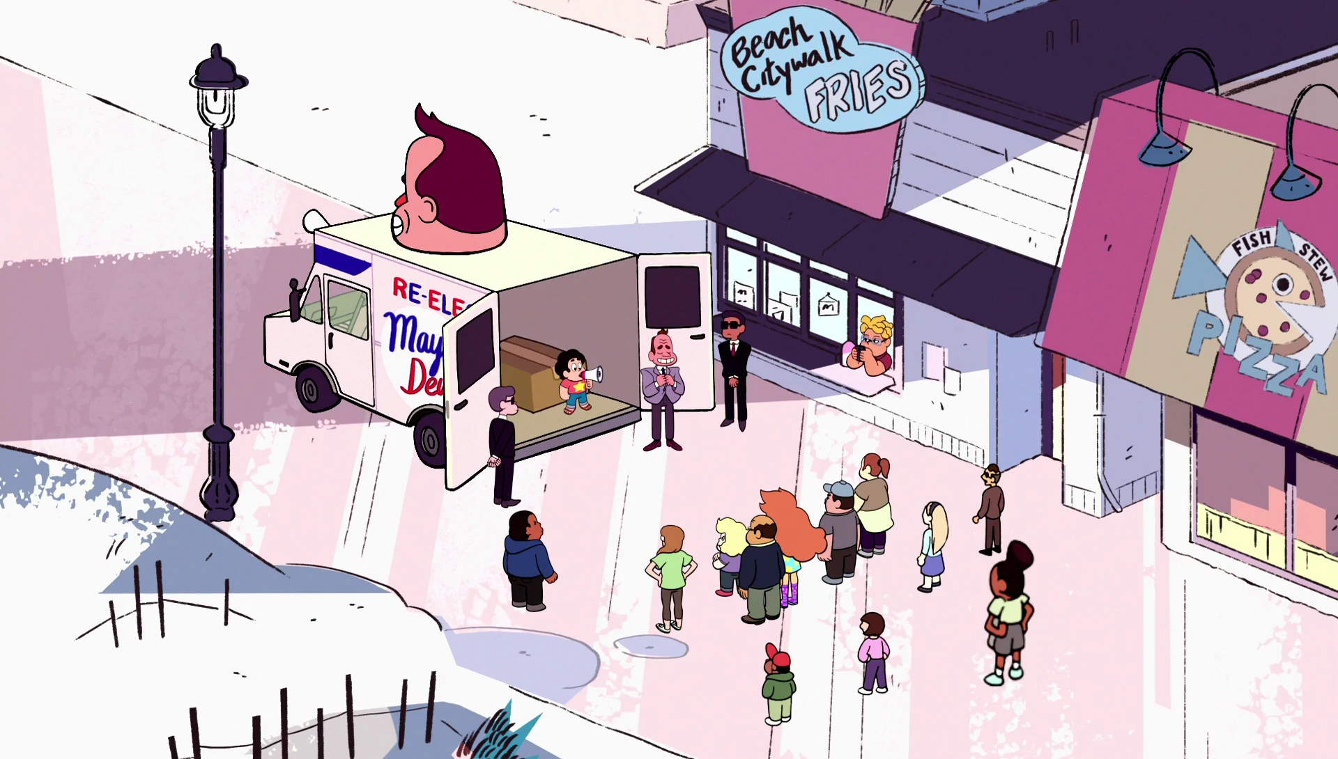 - "I've been mayor of this city for a decade." Timeframes! (This goes with how Sugar said the "Buck Dewey For Mayor!" sign in "Story for Steven" was for Bill's father. I wonder if Buck senior is dead or just retired.)