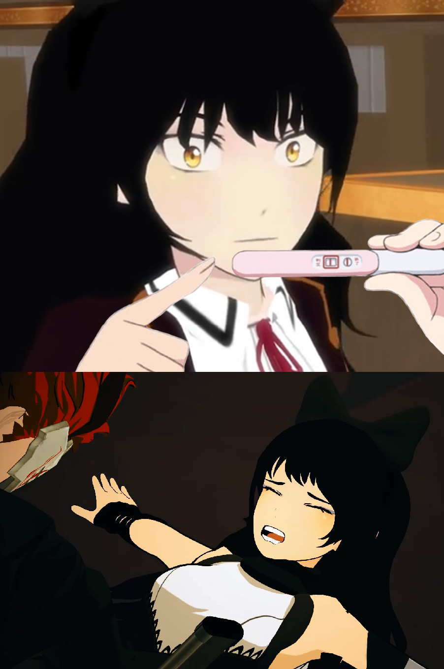 Either Yang has a high pain threshold, she doesn't cry in pain, or she's out cold. If it's the latter, Blake might need a new shirt. Or... Roosterteeth isn't going to have a bloodstained Blake outfit.