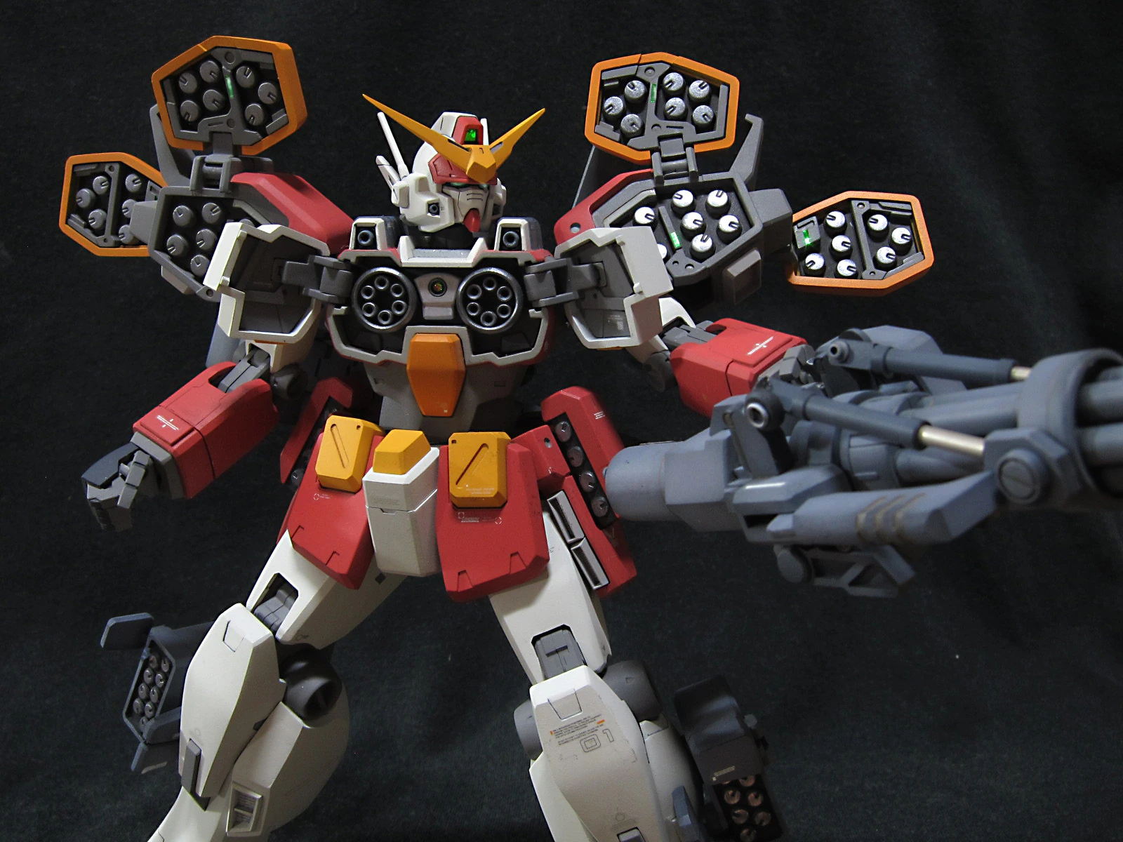 - Andrew was really excited by that one episode where Heero fought Zechs in the Heavyarms by affixing a beam-saber to the gatling gun, so he pushed that angle really heavily. Now every barrel of the gatling shield has a beam saber affixed individually, turning it into a sort of drill-system.