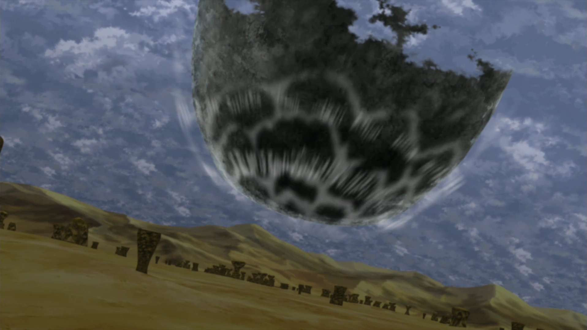 And now, the sky appears to darken significantly more, but not from nightfall. From high above, a rock starts to descend,