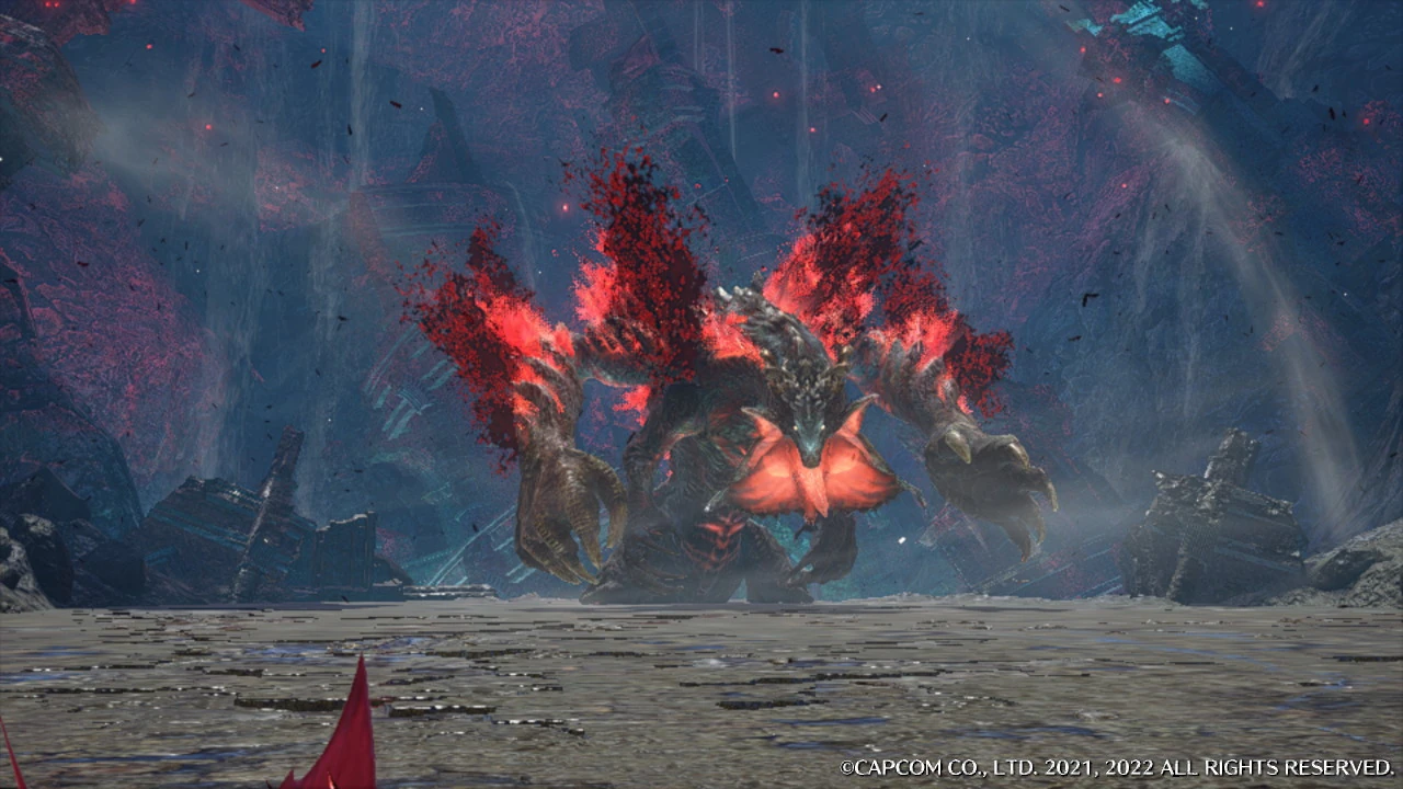 Behind Malzeno, bitchslapping him into the walls surrounding the crater. It then spews balls of Qurio energy into the air which rain down all around it, making a series of destructive explosions.