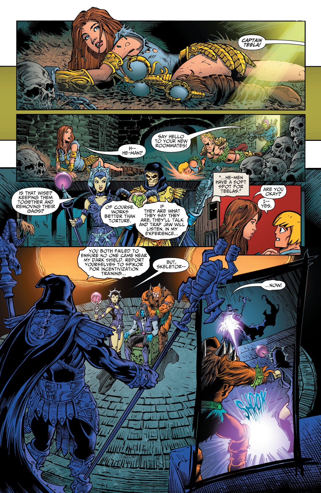 He-Mens to Teela's prison room, he instructed Trap-Jaw to listen to their talk to know if "they are what they say they are", as he says that this way works better than torture, due to He-Mens having "soft spots" for Teelas (which works). Later on Skeletor sends Evil-Lyn and Beast Man to Spikor for incevization training for their failure to ensure that no one comes near to his dark shield, but in reality it was to get himself and Keldor alone, as he want only him to hear his words. Skeletor then reveals