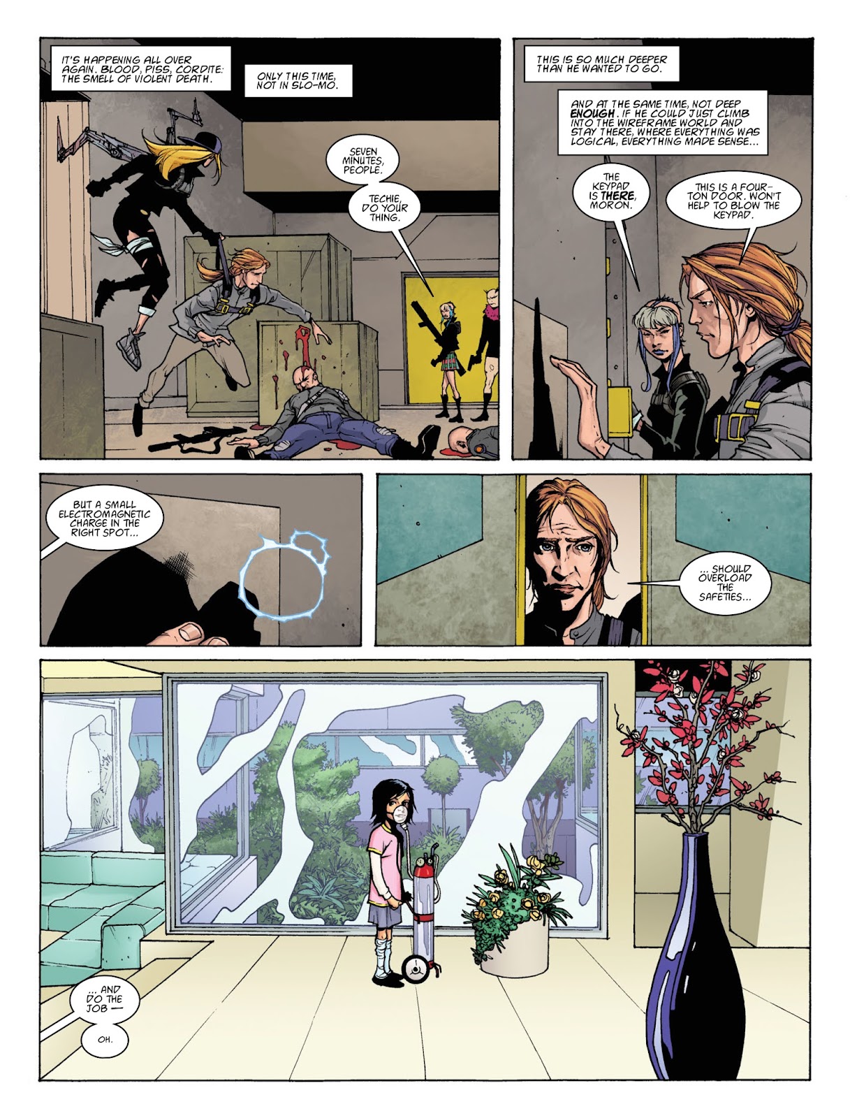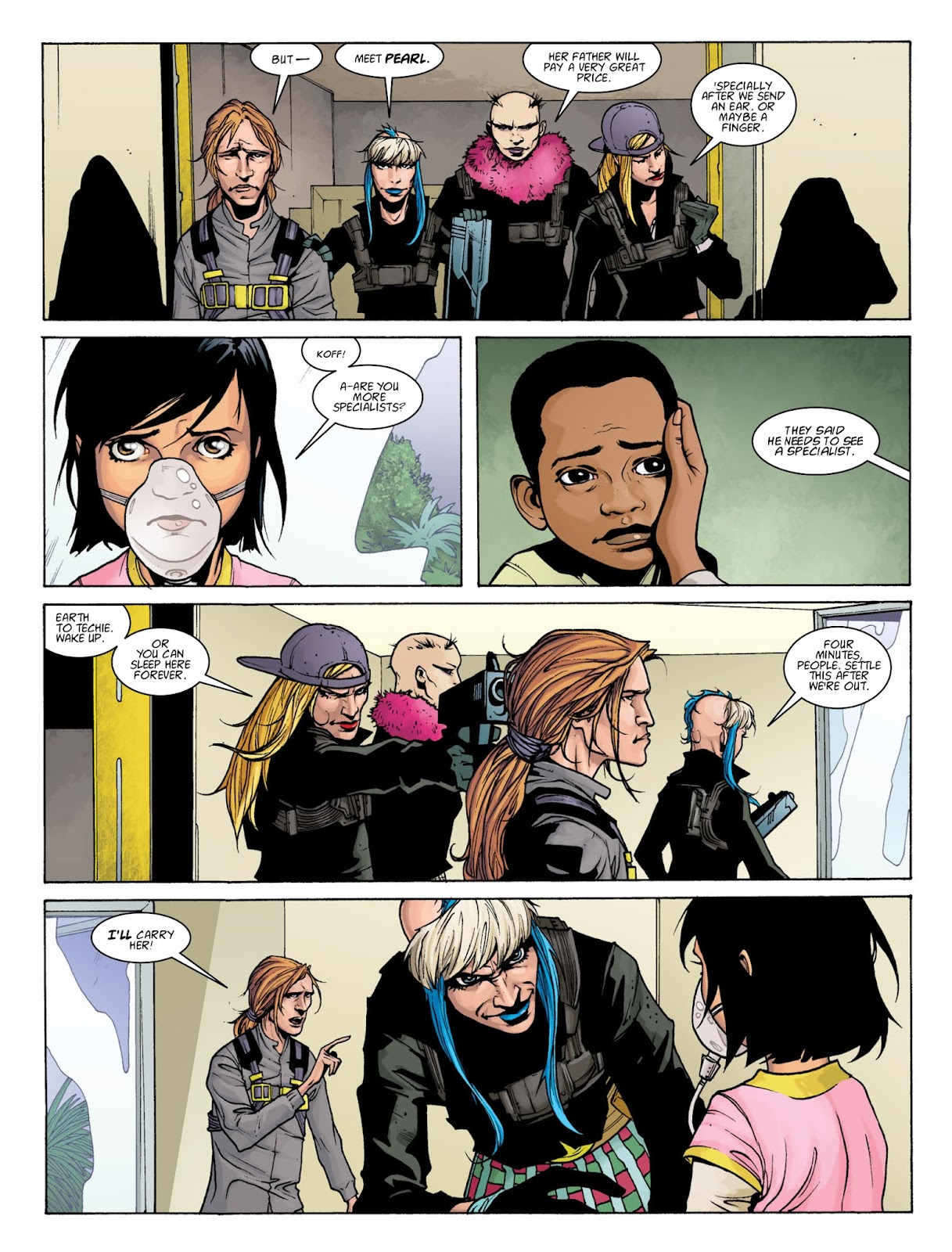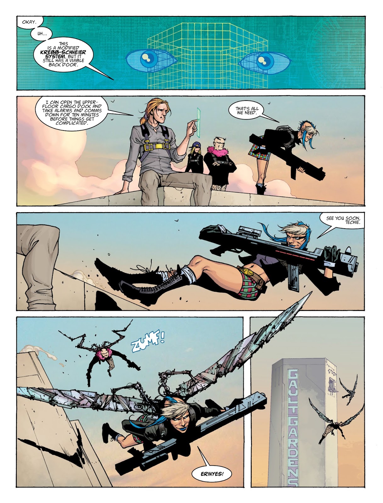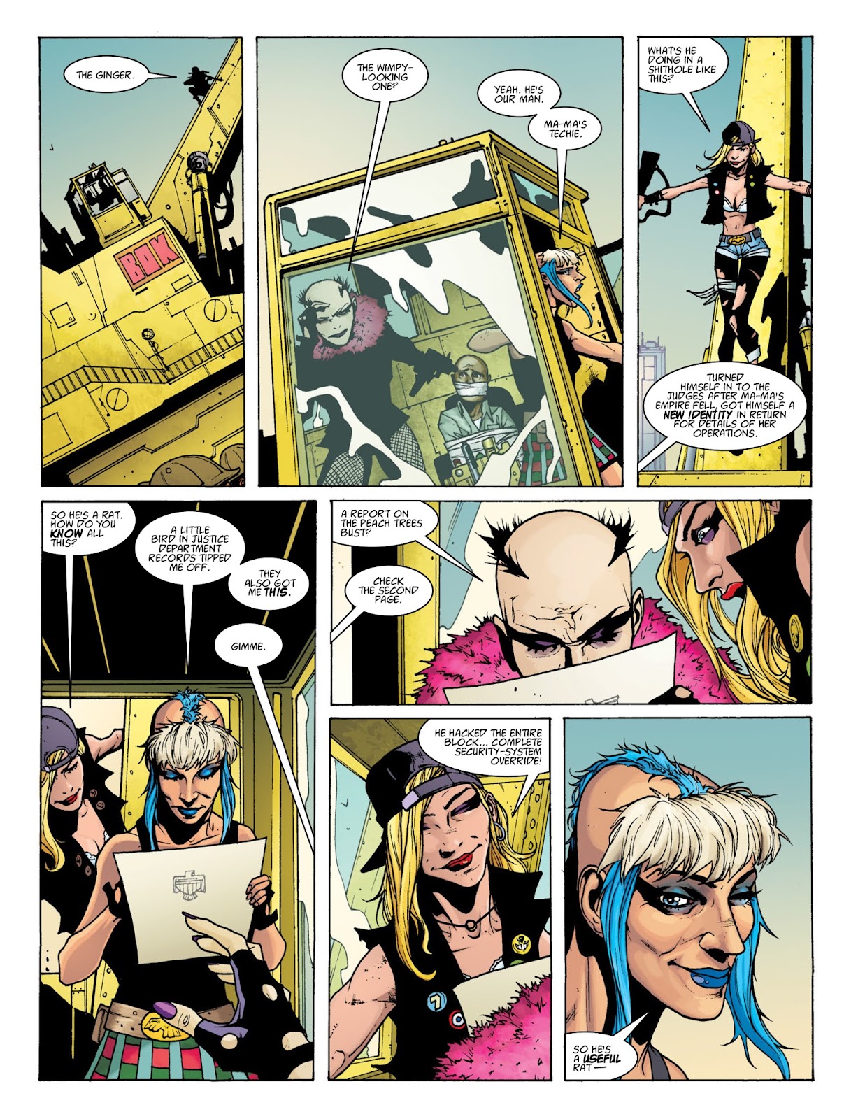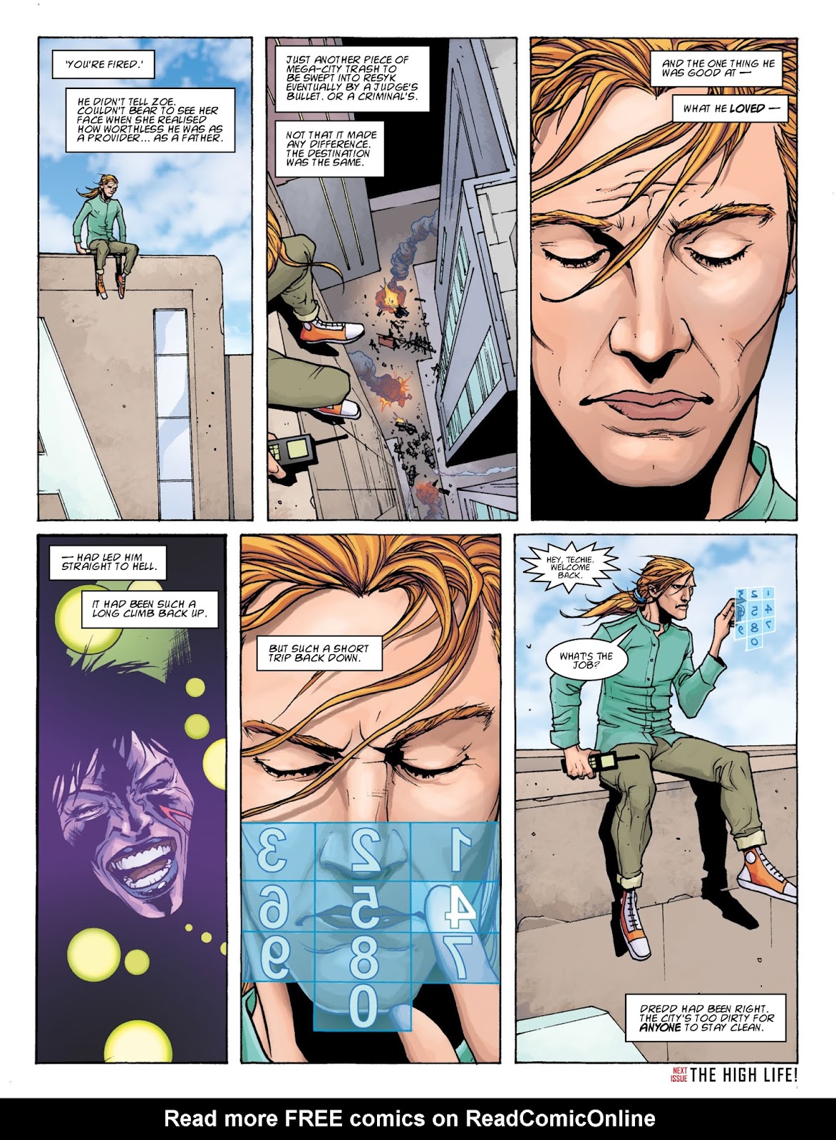 Appearing in the movie as a slave to Ma-Ma, who appeared weak and cowardly and was forced to assist Ma-Ma in her schemes and attempts to wipe out Dredd and Anderson, before he was freed by them and run away, Techie reappers in 3 part comic arc "Furies", where he took