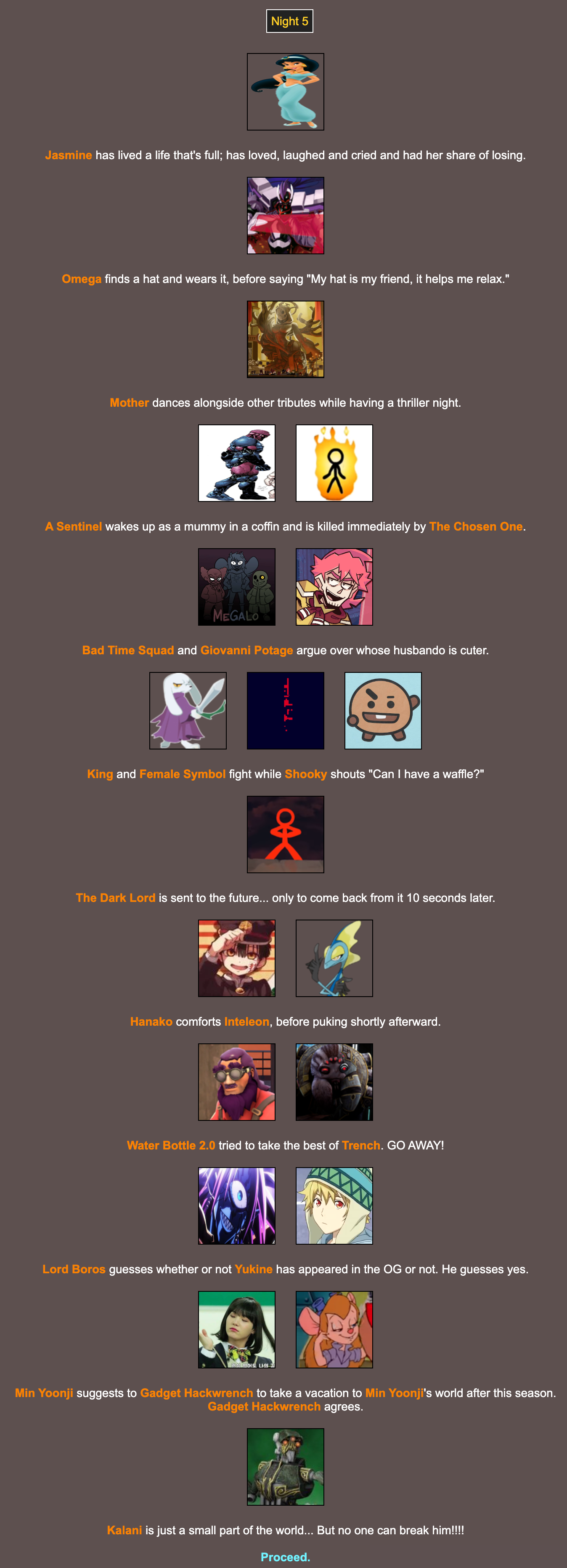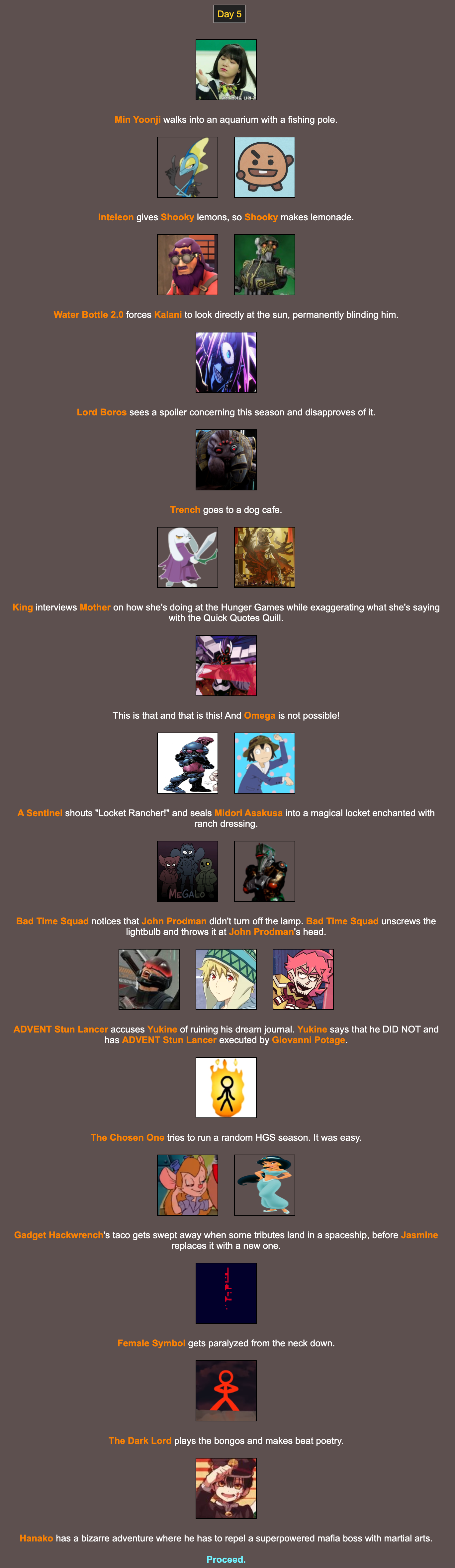 The League of HeroesAnd I also must admit my hosting style this time is inspired by my time on Survivor, as I had to describe everything there. In fact I'm willing to describe a full-blown final battle for Hunger Game seasons like I did for Survivor, as less tributes means I'll have more time and room to do so. If I describe things just the way for are for the final few updates of a season it would be rather short and bland, so describing a final battle may well be a good thing. As for how I'd go about said final battle it would simply be A) a fight between tributes mentioned in said update B) something the tributes unleashed/encountered in previous events or C) both.