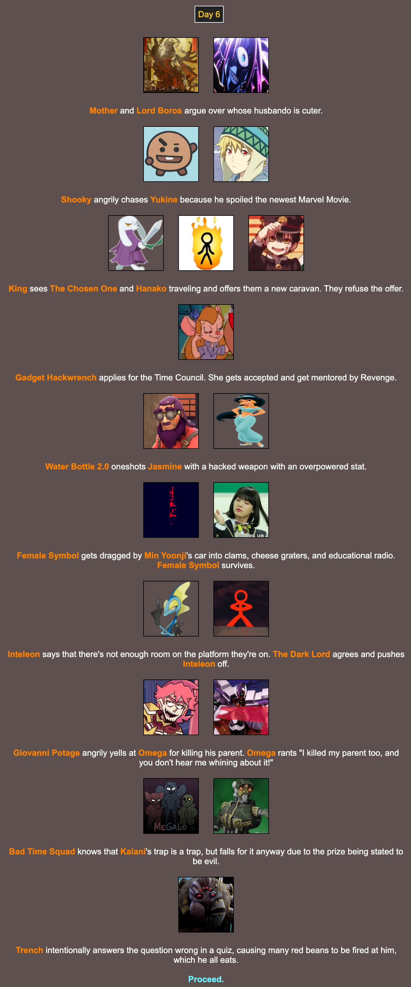 Sorry, had unexpected errands and a movie my mom made me watch. (I picked the movie, but she made me watch it without giving me enough time to do an update)