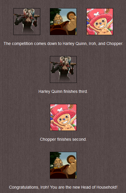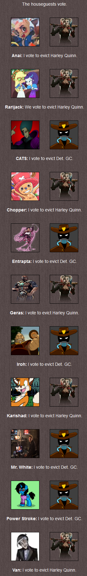◊: Anai, Chopper, Entrapta and Power Stroke vote CATS out, while Rarijack, Det. GC, Geras, Karishad, Mr. White and Neptune vote Iroh. The results are 6-4
