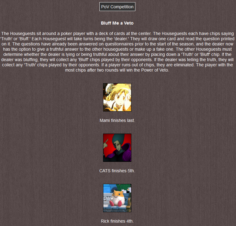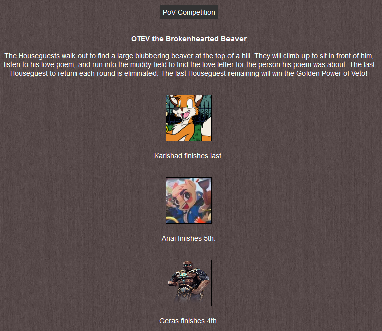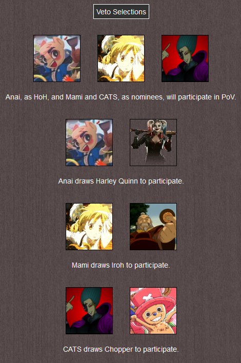 However, this means CATS and Rick will also join Iroh in selecting other houseguests to participate in a second contest, where the winner will win Power of Veto, meaning they can choose one nominated houseguest, including themselves, to be replaced by someone else. The selected guests are Anai, Power Stroke and MamiThe results:
