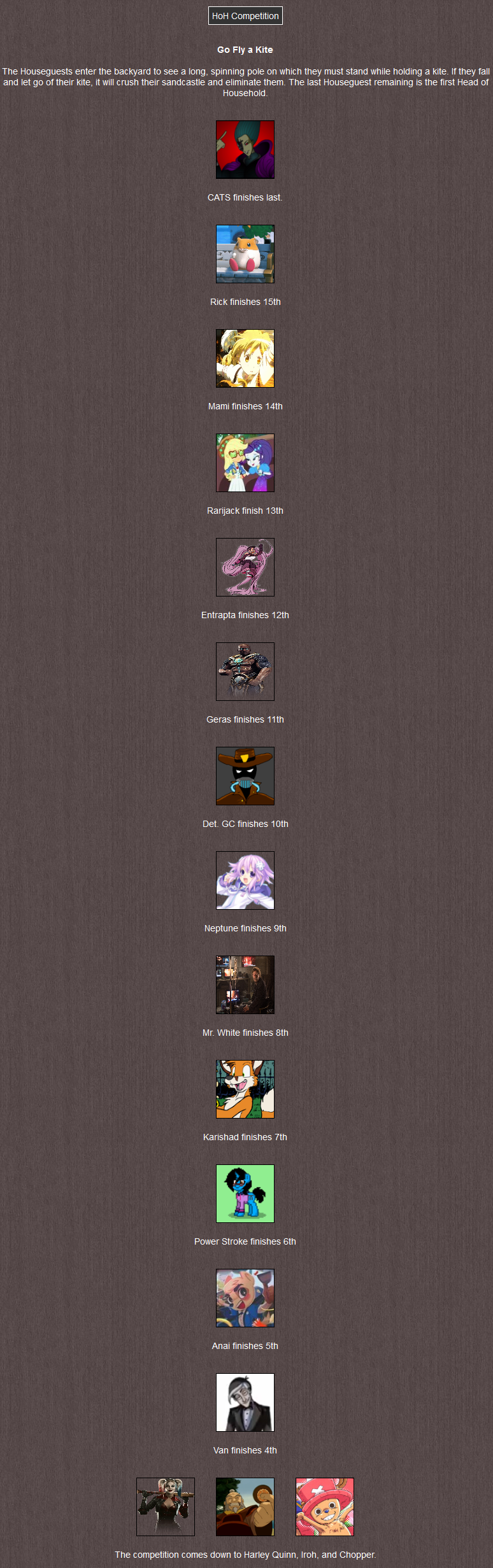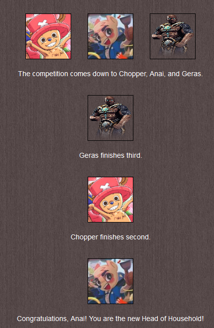 ◊ It's a close competition between the three, but Anai ends up as the winner, finishing right before Chopper who again barely beats Geras.