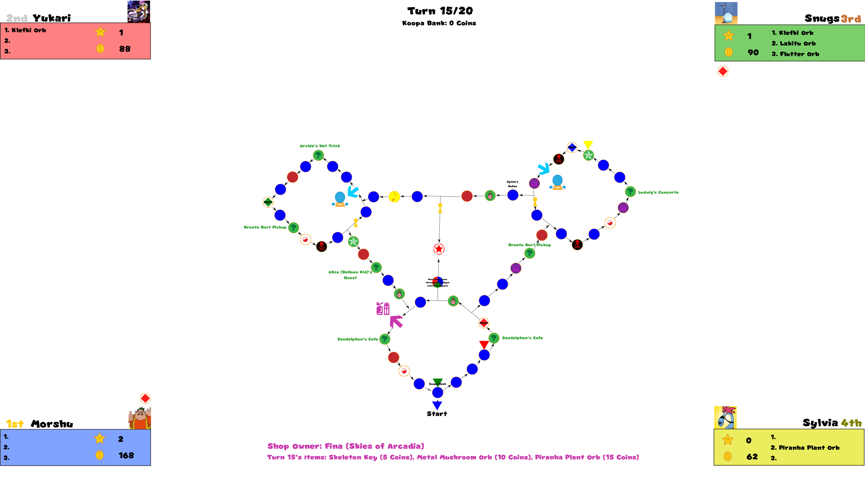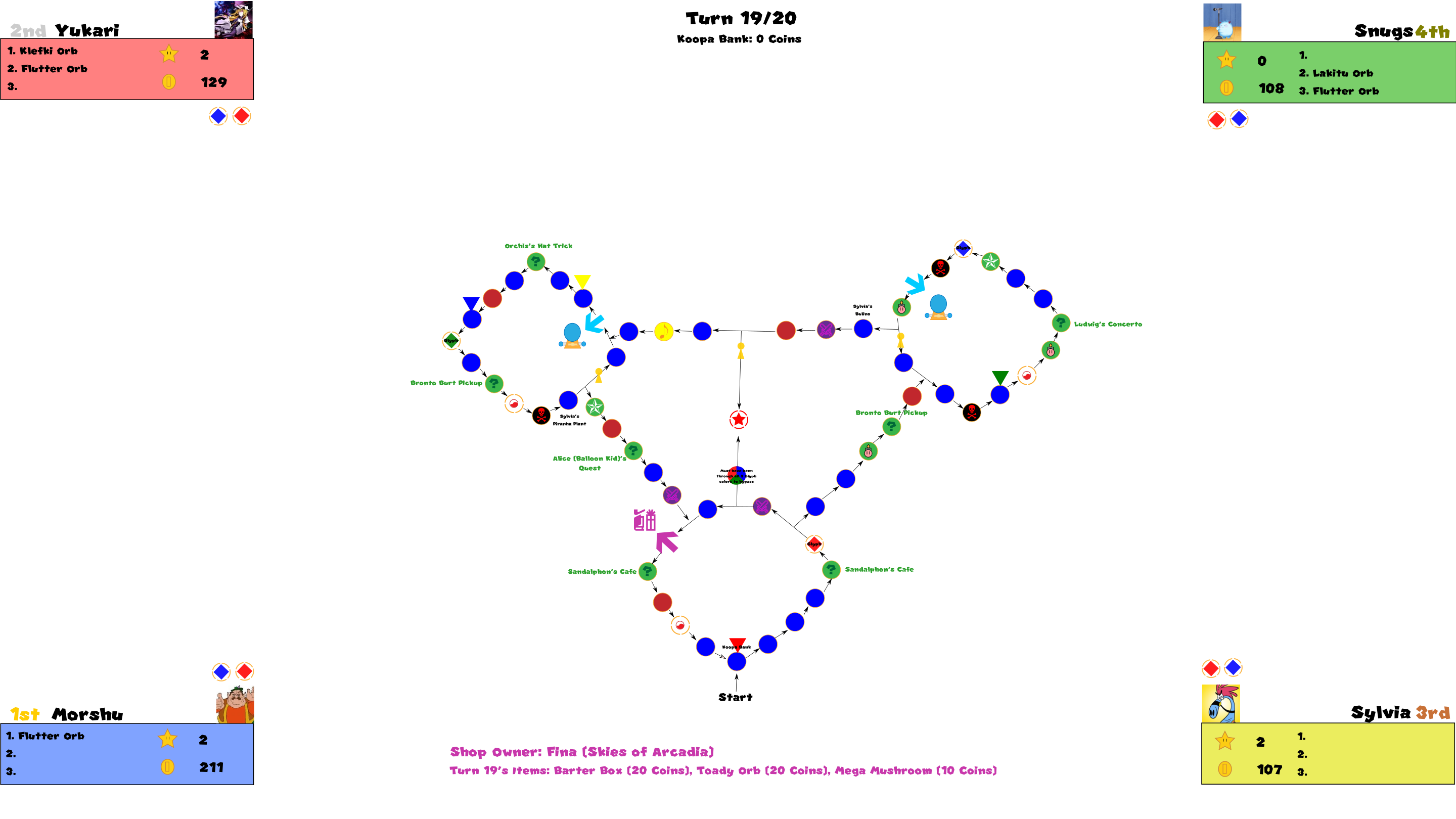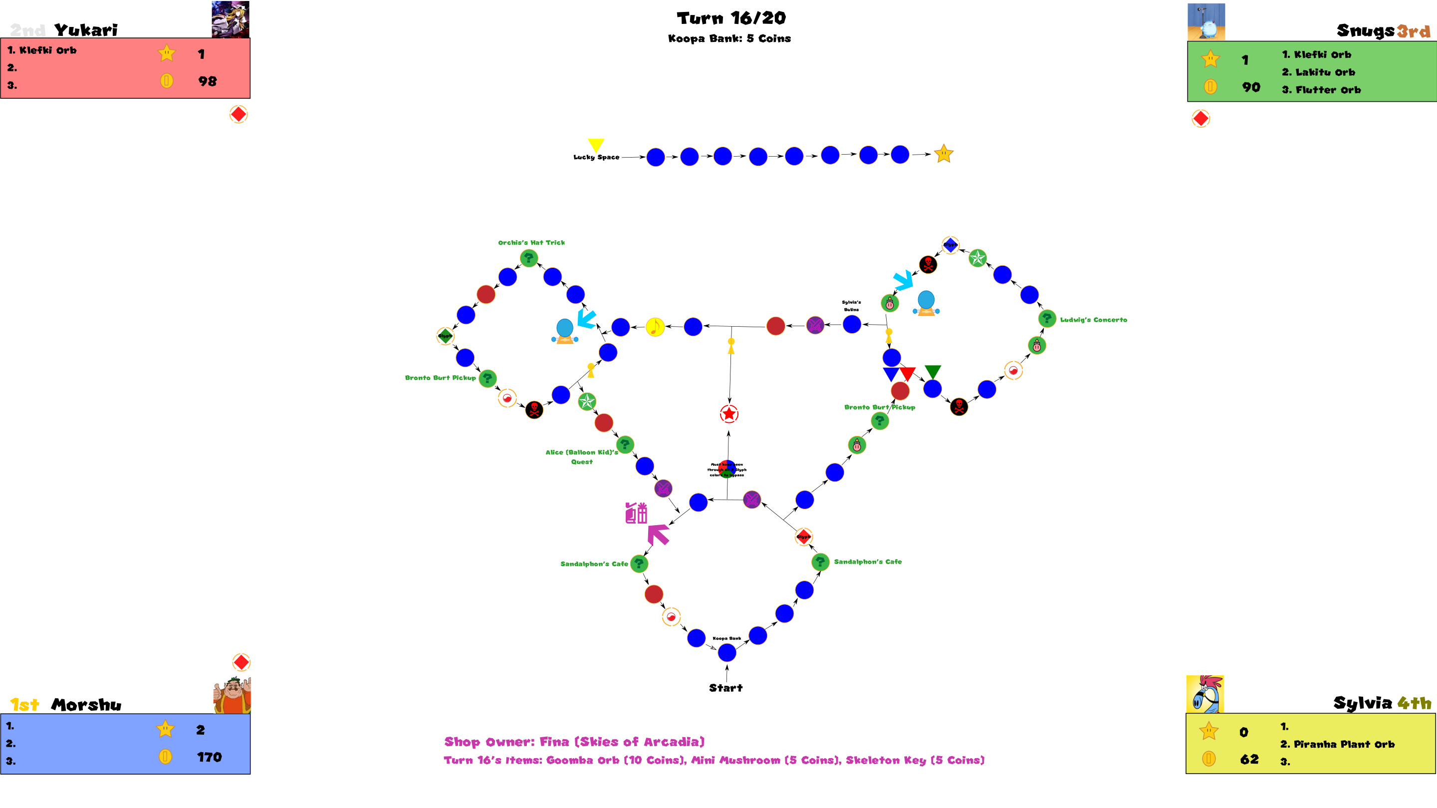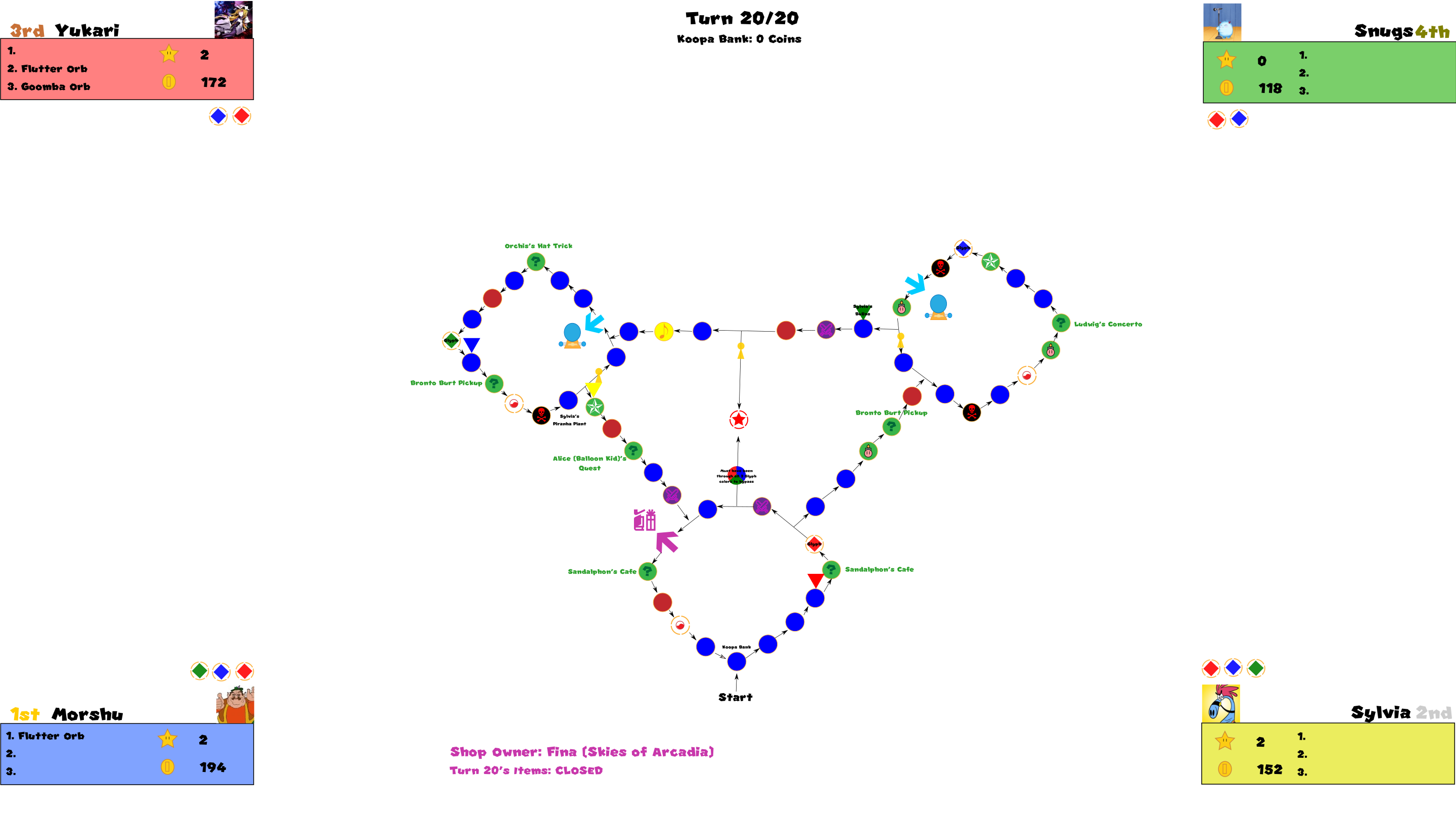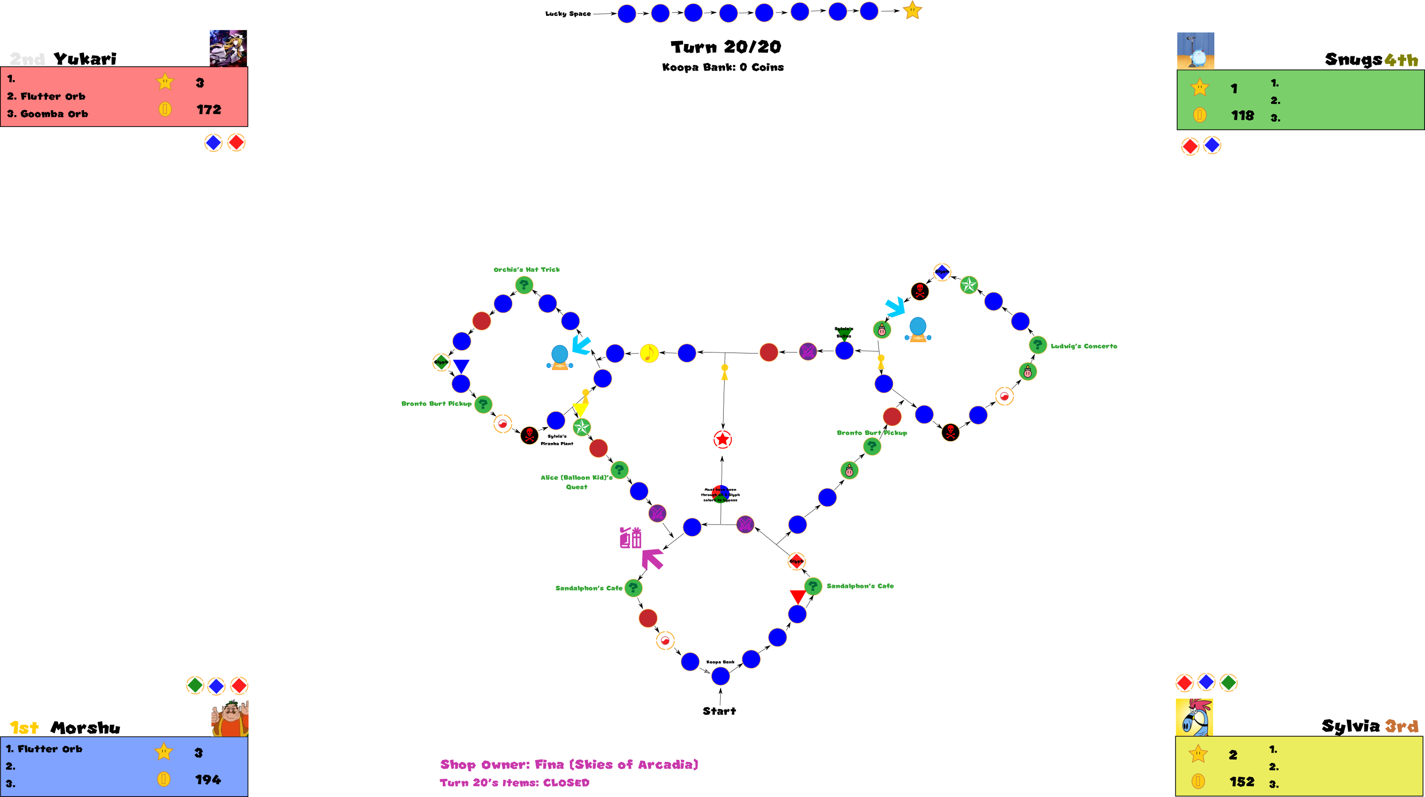 Almost all actions that happen during board play is controlled by the GM (currently leafsaber47). Unique content will be explained either at the explanation update before the board officially begins, and item rules will be recapped and/or explained as a sort of footnote to every update once a player gets them or arrives at the shop for the first time during a turn.
