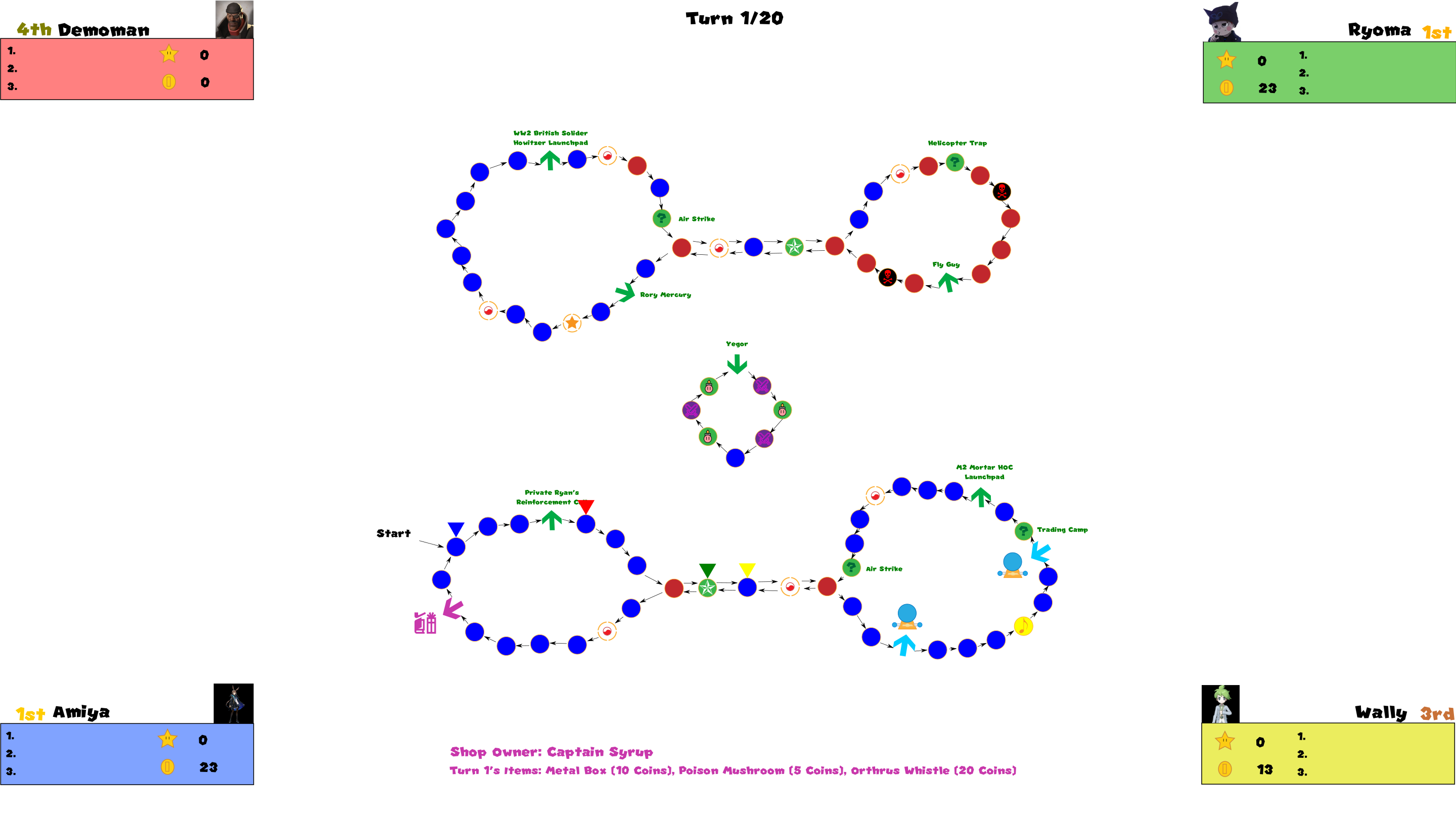Besides the center of the board, the Fly Guy is still around, ready to pick up anyone to it. He may choose another person to target if his vicinity pays out coins. A certain type of Tactical Doll called a HOC hangs out on the bottom right to send players to different islands. The same goes for temporal fishes out of water from Britain using a Howitzer. Near the HOC girls is a trading camp where the player may barter with soldiers hanging out there. A WW2 soldier past his prime is taking a rest near Captain Syrup's shop and a demigod stalks the top left of the board. The rest of the Happening Spaces are pretty much negative and may result in players losing coins or getting sent back to start by force.
