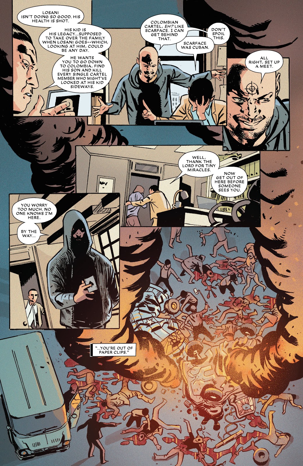 Bullseye promptly arrives in Teodor's city, and goes on a horrific massacre of dozens of people, stapling pictures stating "Bullseye is coming for you, Teodor" to their faces as he goes.