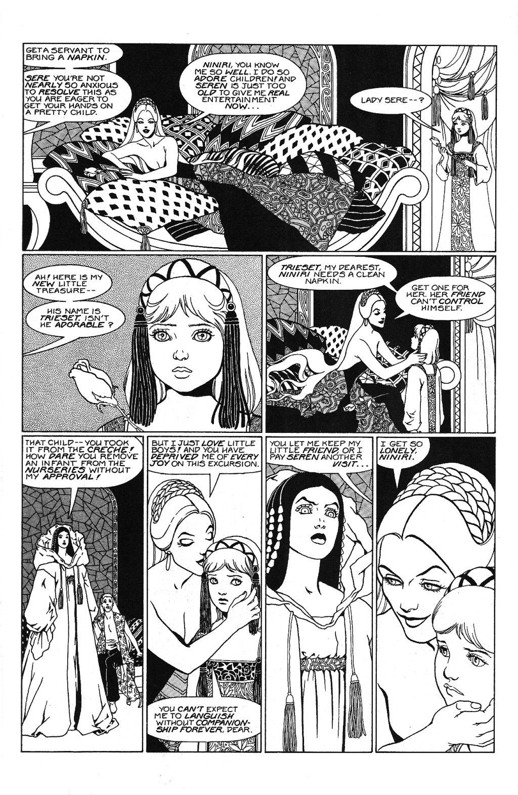 Plotting to wipe out the rebellion, Sere hears of Liana, who is an Avatar herself (her existence is screwing up Rieken/Seren's control)...her reaction? "She's so pretty! Her golden eyes are a rare feature, and she's so young! An infant really... Don't dispose of the child before I've had a chance to have my pleasure." Sere then reveals she has a young attendant she took from the Ovanan nurseries (they're grown artificially), a grievous crime Niniri rebukes her for. Sere cheerfully remarks
