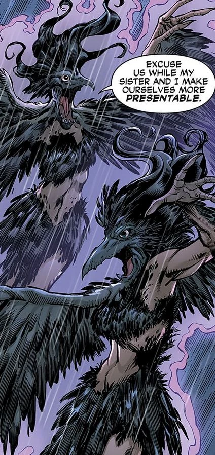 The Crow Sisters, a pair of crow-like monsters who take human form and first show off their inhuman nature when watching the gladiator games. One drunk man makes the error of bothering one and she promptly bites his fingers off. Anive and Lila have existed since time began. After thousands of years of experience, the Corvidae are bored....except in one thing: Battle. The two have seen that to gamble off unexpected wagers are the most exciting things in existence. So they arrange things to turn friend against friend, brother against brother, start wars to see armies against armies...killing countless to claim trophies and win wagers against one another.