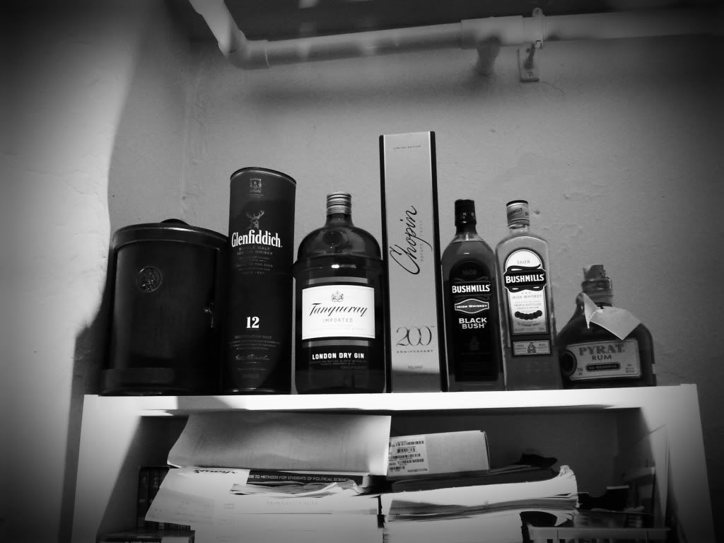 Dramatic black and white of my booze collection