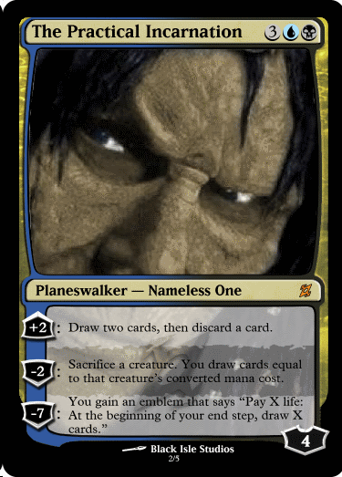 -8: You gain an emblem that says "The 'planeswalker rule' does not apply to your Planeswalkers." Then search your library for any number of Planeswalkers with the subtype "Nameless One" and put them onto the battlefield.