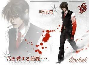 Well, I don't know what happens, but I have a picture of this girl from an Anime with brownish hair, red eyes and blood on her clothes and mouth. Her clothes are kind of like a school uniform...Link here to picture: